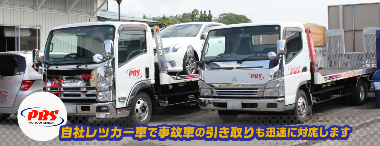 事故車の引き取りはプロボディー仙台株式会社にお任せください。自社レッカー車で駆けつけます。お見積もりは無料です。保険事故の場合は保険会社との打ち合わせ修理協定を担当いたします。